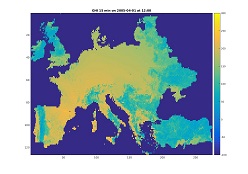 If you extract hdf5 data as a time series for one location, you will get almost the same data as CAMS Radiation web interface. For example, CAMS_Radiation_GHI_at_point_300_on_2005-01-10.jpg compares CAMS Radiation GHI on 2005-01-10 at location (57.4, -2.4) extracted from the web interface and from ghi_2005.h5. The small difference is due to the data compression as 1 byte per value in AGATE. |  Click on the image to magnify: GHI on 2005-04-01 from 11h45 to 12h00 UT |