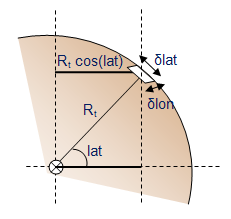The spatial resolution is the size of the projection a MSG pixel onto the Earth surface. It depends on the latitude and longitude of this projection. For MSG, the spatial resolution is illustrated on the right hand side. The nadir, i.e. the point of the Earth surface located just below the satellite, is (lat, lon) = (0°,0°) and corresponds to the center of the image. The spatial resolution at nadir is 3 km and is decreasing as we moved away from this point. The resolution ranges from 3 km to more than 12 km on the edges of the planet.