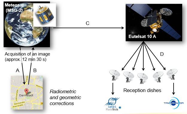 The path of Meteosat (Nadir at 0°,0°) images, from satellite to rooftop dishes