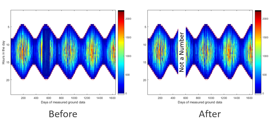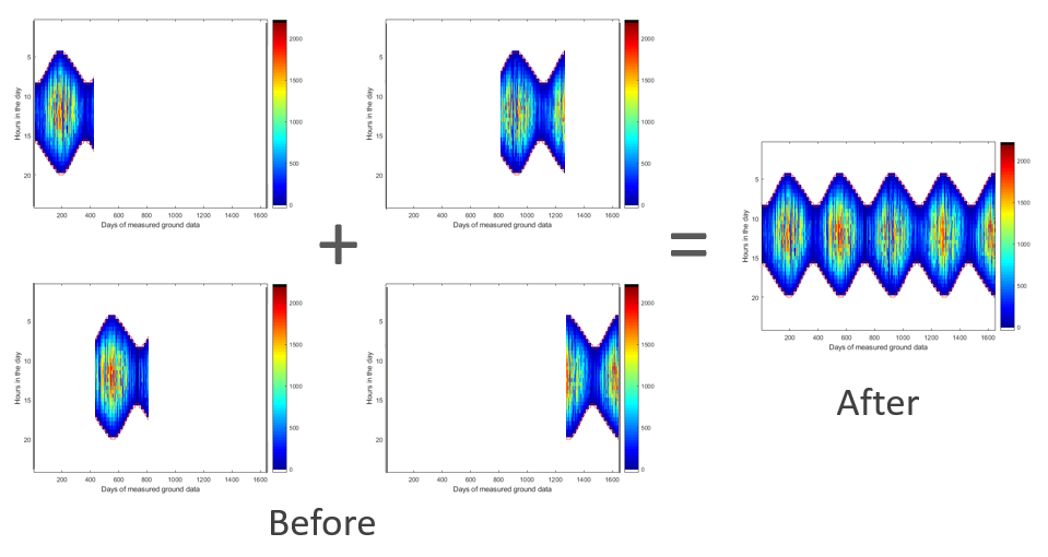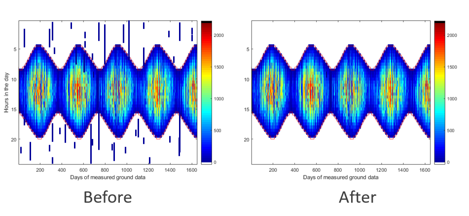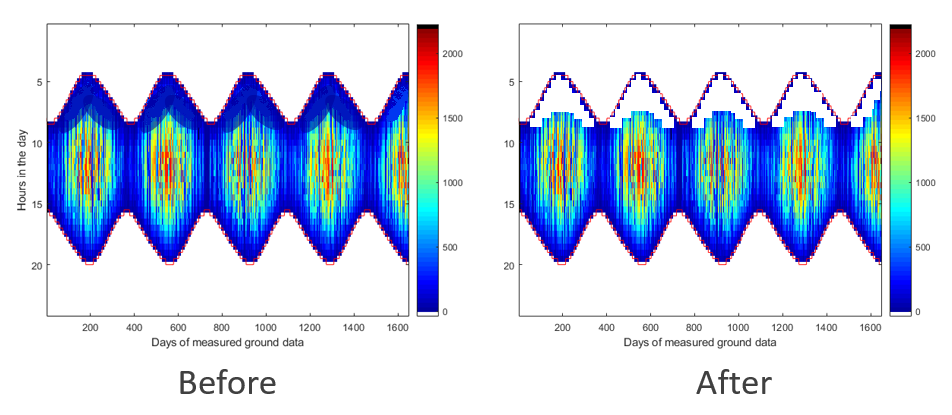 Discard shadowed instants: | Shadowed instants can be detected by using heat maps like on these pictures, and confirmed by taking a look at the "one-day graph" and to the "Shadow map". As the measurements are partially masked, these data need to be discarded to be compared to other datasets, or within the framework of the calibration of long-term satellite-derived radiation values using these measurements. |