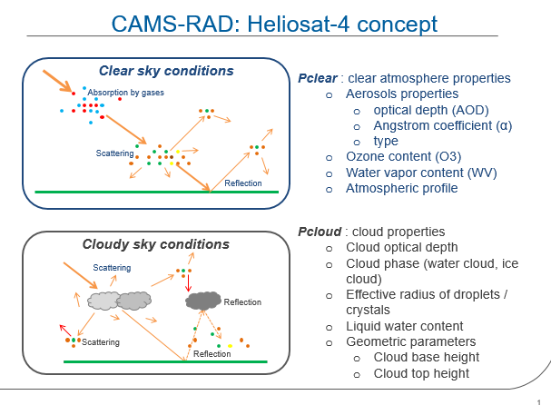 CAMS (Copernicus Atmosphere Monitoring Service) solar radiation services are composed of two services: CAMS radiation service and CAMS McClear. McClear is one of the major outcome of the CAMS project, which contributes to a detailed assessment of optical variables in the atmosphere (gaz, aerosols, water vapour), clouds and ground albedo. The model exploited in McClear estimates the radiation that should be received if the sky were clear anywhere, since 2004. This model has been created by the Centre O.I.E., the DLR, the Finnish Meteorological Institute), and the European Center for Medium-range Weather Forecasts ECMWF. The method Heliosat-4 processes Meteosat images to create the CAMS radiation service. This method is mainly based on the principle of separability between the clear sky radiation (CAMS McClear), and the effects of clouds (cloud properties from APOLLO, DLR) and ground albedo (derived from MODIS). Please take a look to the description of Heliosat-4 in three slides below. CAMS radiation service covers Europe, Africa, the Mediterranean Basin, the Atlantic Ocean and part of the Indian Ocean (-66° to +66° both in latitude and longitude). CAMS radiation service delivers spectrally-integrated 15 minute Global Horizontal Irradiance (GHI) and Direct Normal Irradiance (DNI) values. |