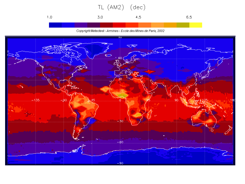 | MAPS | The Linke turbidity factor (TL, for an air mass equal to 2) is a very convenient approximation to model the atmospheric absorption and scattering of the solar radiation under clear skies. It describes the optical thickness of the atmosphere due to both the absorption by the water vapor and the absorption and scattering by the aerosol particles relative to a dry and clean atmosphere. It summarizes the turbidity of the atmosphere, and hence the attenuation of the direct beam solar radiation. The larger TL, the larger the attenuation of the radiation by the clear sky atmosphere. The TL denotes the transparency of the cloudless atmosphere. If the sky were perfectly dry and clean, TL would be equal to 1. When the sky is deep blue, the TL is just above 1 and still very small. In summer, in Europe, the water vapour is often large and the blue sky is close to white. The TL is larger than 3. In turbid atmosphere, e.g. in polluted cities, the TL is close to 6 - 7. Grid description: