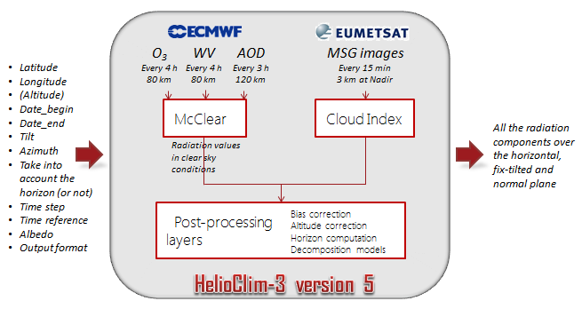 The HelioClim-3 database stores the 15 minute GHI values. When the user launch a request, post-processing layers are applied to correct these values, as illustrated by the following picture on HelioClim-3 version 5. Then decomposition models computes the radiation components on the plane orientation as requested.