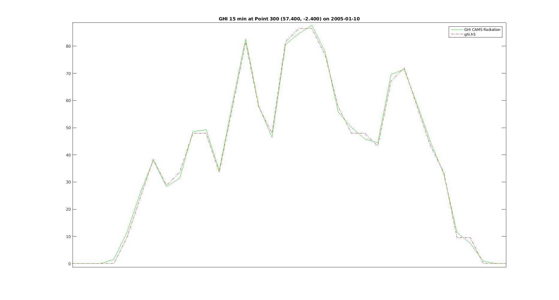 If you extract hdf5 data as a time series for one location, you will get almost the same data as CAMS Radiation web interface. For example, CAMS_Radiation_GHI_at_point_300_on_2005-01-10.jpg compares CAMS Radiation GHI on 2005-01-10 at location (57.4, -2.4) extracted from the web interface and from ghi_2005.h5. The small difference is due to the data compression as 1 byte per value in AGATE. | ![]() Click on the image to magnify: GHI on 2005-04-01 from 11h45 to 12h00 UT |
