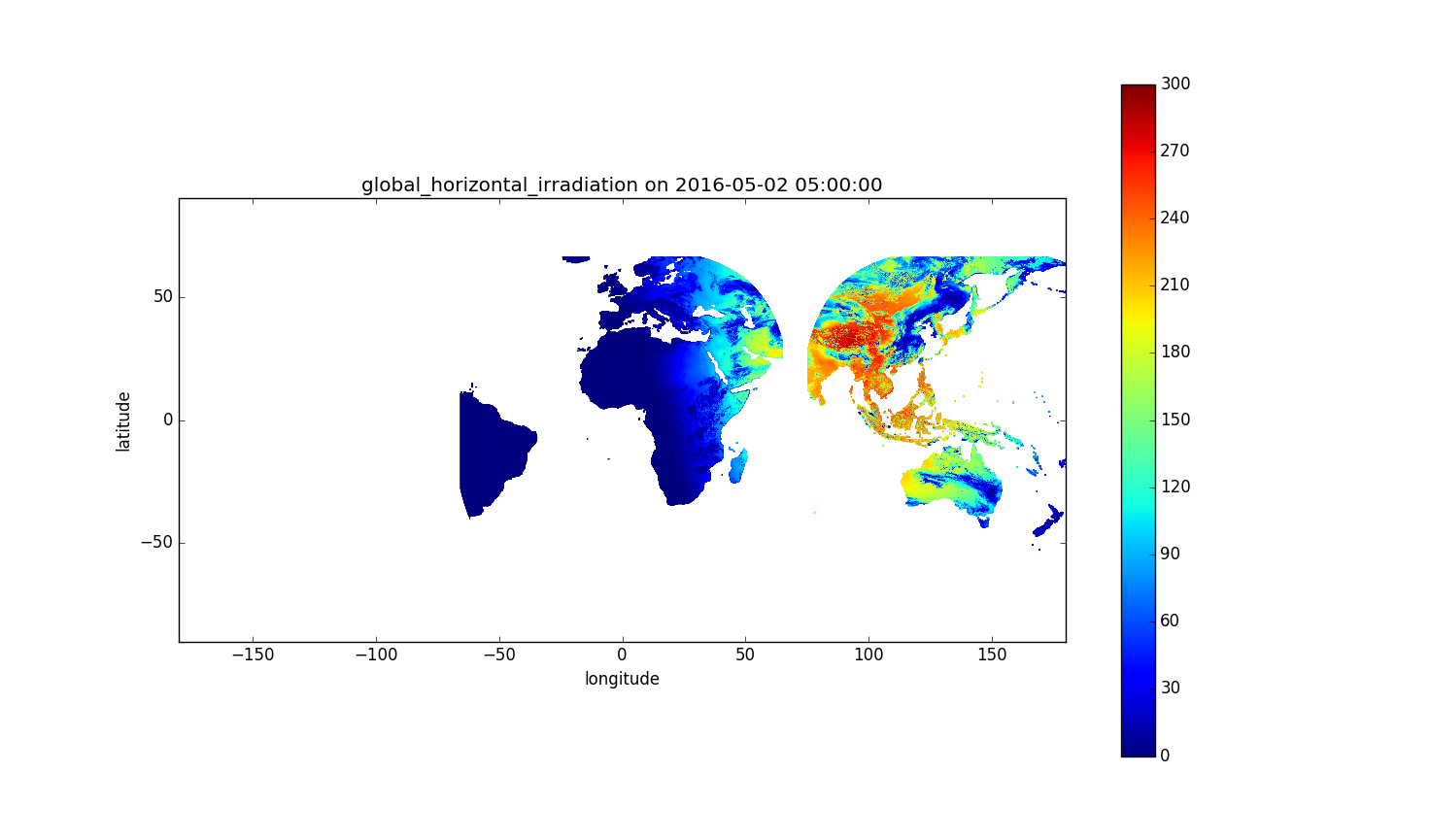 | Volume content | Each NetCDF dataset comprises up to 2976 maps, which correspond to the number of 15 min periods in 1 month. Each value in NetCDF files contains 15 min irradiation in Wh/m². The value NaN denotes a grid cell over the sea or out of MSG field of view (not computed) or a computation error. WARNING: Data are compressed in NetCDF files. In version 4.5, end users had to convert 254 and 255 values to NaN, and to multiply the other values by 1.2. In version 4.6, this is done automatically by NetCDF library. Note: | ![]() Click on the image to magnify: GHI on 2016-05-02 from 4h45 to 5h00 UT |