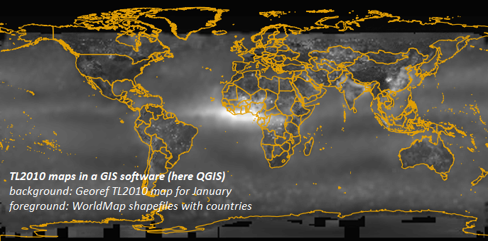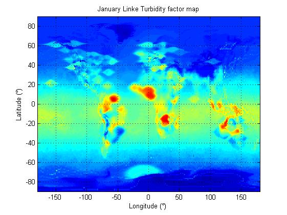 Tl 2003 maps | Twelve monthly maps of Linke turbidity factor values were created given by latitude and longitude. Latitude is positive North, longitude is positive eastwards of longitude 0. The data are in gridded, raw format, no header (tiff images), 1 byte per value (unsigned int encoding), 2160 rows and 4320 columns. Cell size is 5' (approx. 10 km at mid-latitude). Upper left corner is 90 N, 180 W. Then, point 90 N, 179.5 W etc. Lower right is 90S, 180 E. Download images in png format: January, February, March, April, May, June, July, August, September, October, November, December. Download images in tiff format (zip compressed) by trimesters: 1st trimester, 2nd, 3rd, 4th | ![]() ![]() Two representations for January Tl values. (Click on images to magnify) |