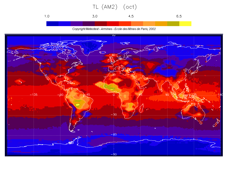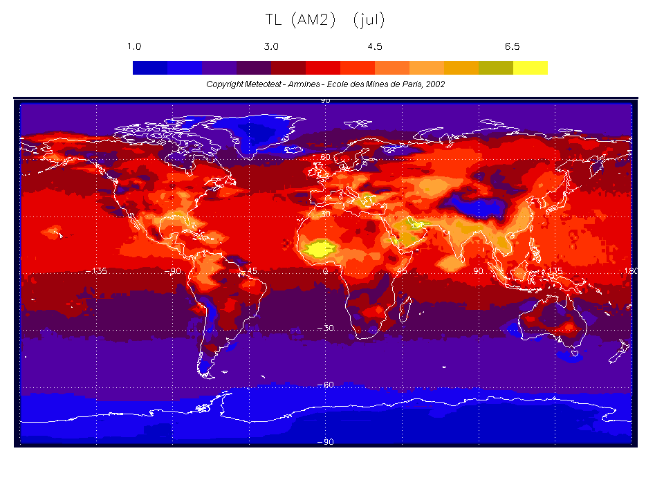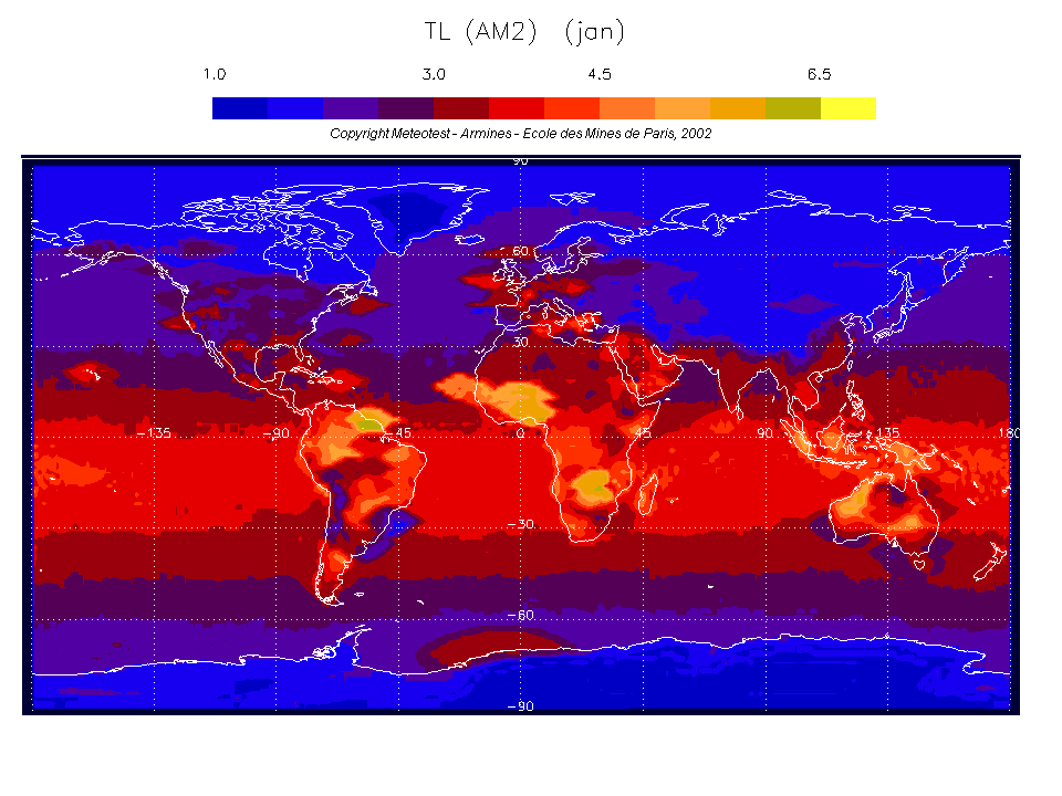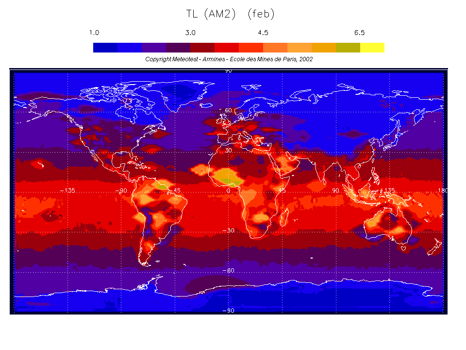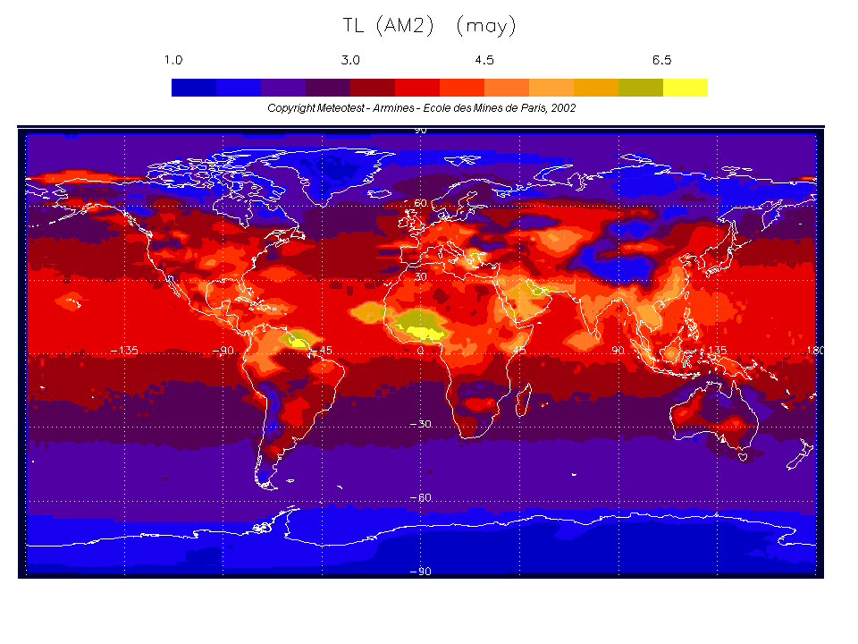 | MAPS | The Linke turbidity factor (TL, for an air mass equal to 2) is a very convenient approximation to model the atmospheric absorption and scattering of the solar radiation under clear skies. It describes the optical thickness of the atmosphere due to both the absorption by the water vapor and the absorption and scattering by the aerosol particles relative to a dry and clean atmosphere. It summarizes the turbidity of the atmosphere, and hence the attenuation of the direct beam solar radiation. The larger TL, the larger the attenuation of the radiation by the clear sky atmosphere. The TL denotes the transparency of the cloudless atmosphere. If the sky were perfectly dry and clean, TL would be equal to 1. When the sky is deep blue, the TL is just above 1 and still very small. In summer, in Europe, the water vapour is often large and the blue sky is close to white. The TL is larger than 3. In turbid atmosphere, e.g. in polluted cities, the TL is close to 6 - 7. Grid description:
