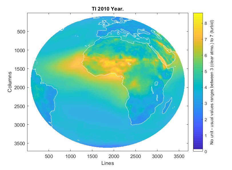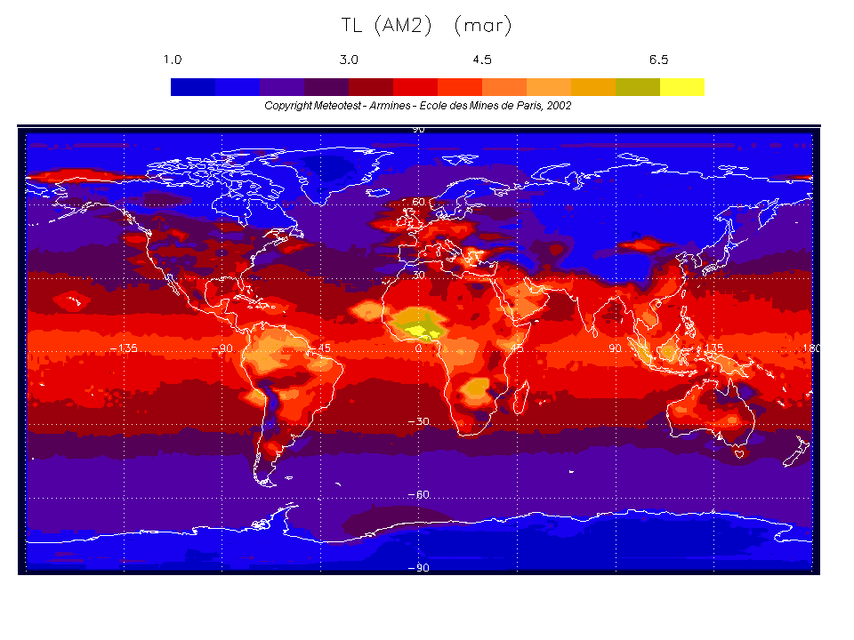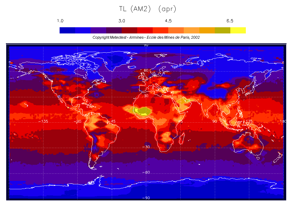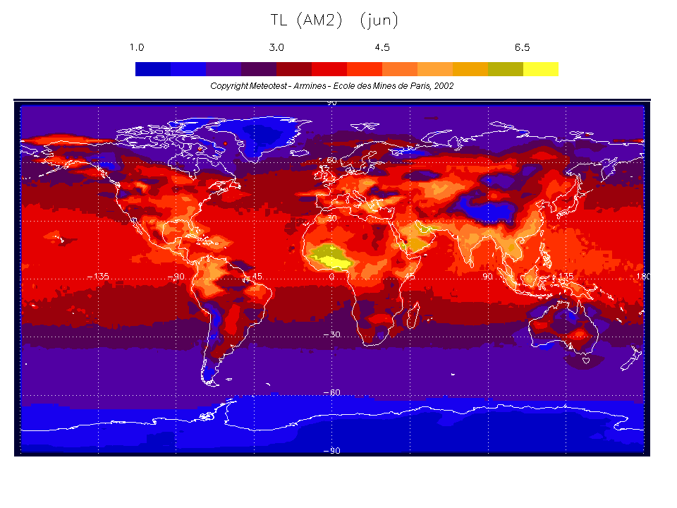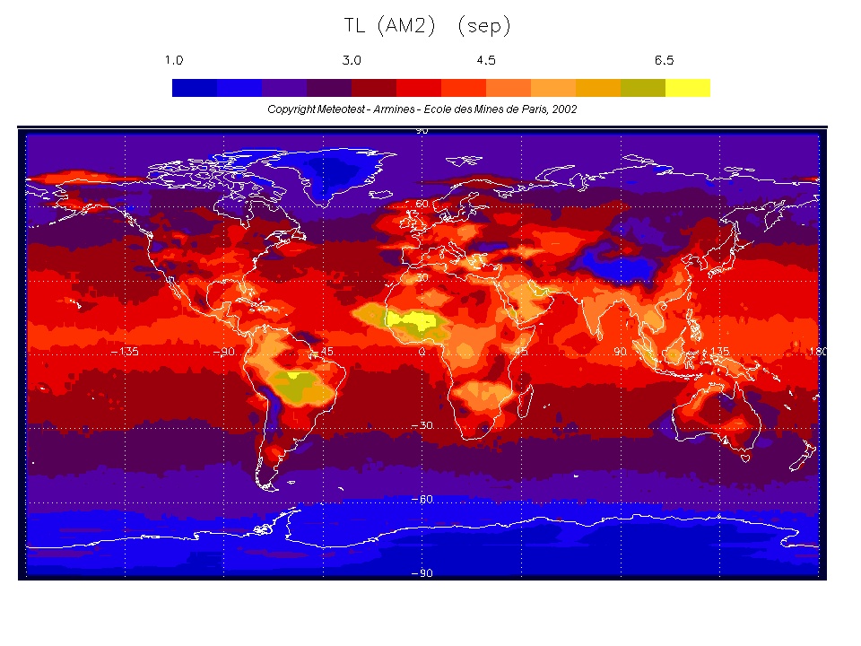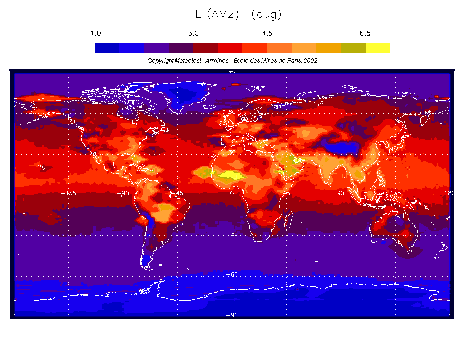 | MAPS | The Linke turbidity factor (TL, for an air mass equal to 2) is a very convenient approximation to model the atmospheric absorption and scattering of the solar radiation under clear skies. It describes the optical thickness of the atmosphere due to both the absorption by the water vapor and the absorption and scattering by the aerosol particles relative to a dry and clean atmosphere. It summarizes the turbidity of the atmosphere, and hence the attenuation of the direct beam solar radiation. The larger TL, the larger the attenuation of the radiation by the clear sky atmosphere. The TL denotes the transparency of the cloudless atmosphere. If the sky were perfectly dry and clean, TL would be equal to 1. When the sky is deep blue, the TL is just above 1 and still very small. In summer, in Europe, the water vapour is often large and the blue sky is close to white. The TL is larger than 3. In turbid atmosphere, e.g. in polluted cities, the TL is close to 6 - 7. Grid description: