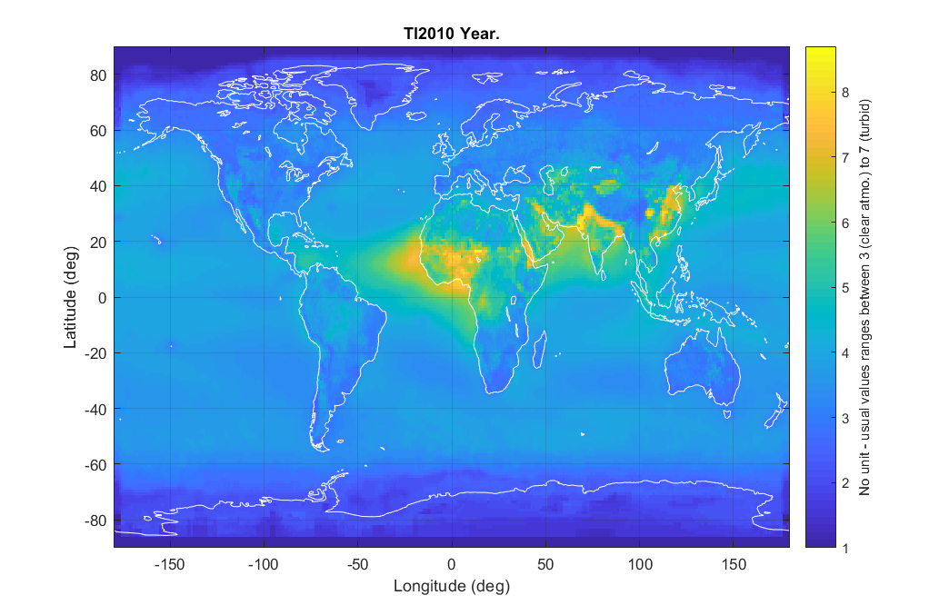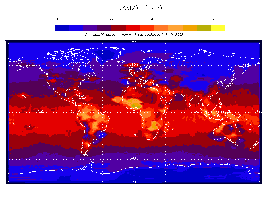 | Methodology | Within the project SoDa More in details, the Linke turbidity is based on several global information from satellites like global clear sky radiation (SRB gridded data from NASA), precipitable water vapour (NVAP), aerosol optical depth (pathfinder) and ground information about turbidity from radiation or aerosol measurements (AERONET). Turbidity has been calculated with beam or global radiation measurements at the ground with help of the ESRA (European Solar Radiation Atlas) clear sky radiation model. Satellite and ground information have been fitted together. In order to cope with the large differences in spatial resolution, fusion methods have been applied on these date together with water vapour maps and orography information. Errors were assessed by cross-checking (LOOV-Leave One Out Validation) which consists in removing one station (out of approx. 220), making calculation for this site (using the elevation database and not the actual elevation) and computing the discrepancy. The bias was found to be 0.01 and the RMSE 0.73 as an annual average with slight deviations from month to month. Publications, with - keyword "Linke Turbidity factor": WMO 1981; Kasten 1996, Remund et al. 2003, Diabaté et al. 2003, Rigollier et al. 2000, see also Holben et al. 2001. | |