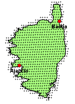 The Meteosat satellites are geostationnary, i.e. they operate in equatorial orbits at an altitude of 35 790 kilometers above the surface of Earth. The size of the image is 3712 by 3712 pixels. You need approx. 354 000 pixels to cover the whole Europe, 307 000 for the Arabian Peninsula, 63 000 for Turkey and 48 000 for France. Don't hesitate to contact us to receive for free the locations of the centers and corners of the Meteosat pixels in latitude and longitude in a CSV file. | ![]() Corners of MSG pixels for Corsica |