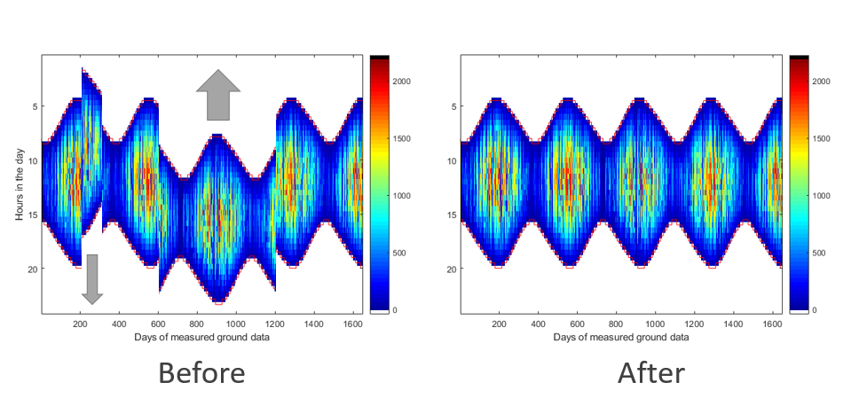 Discard shadowed instants: | Shadowed instants can be detected by using heat maps like on these pictures, and confirmed by taking a look at the "one-day graph" and to the "Shadow map". As the measurements are partially masked, these data need to be discarded to be compared to other datasets, or within the framework of the calibration of long-term satellite-derived radiation values using these measurements. |